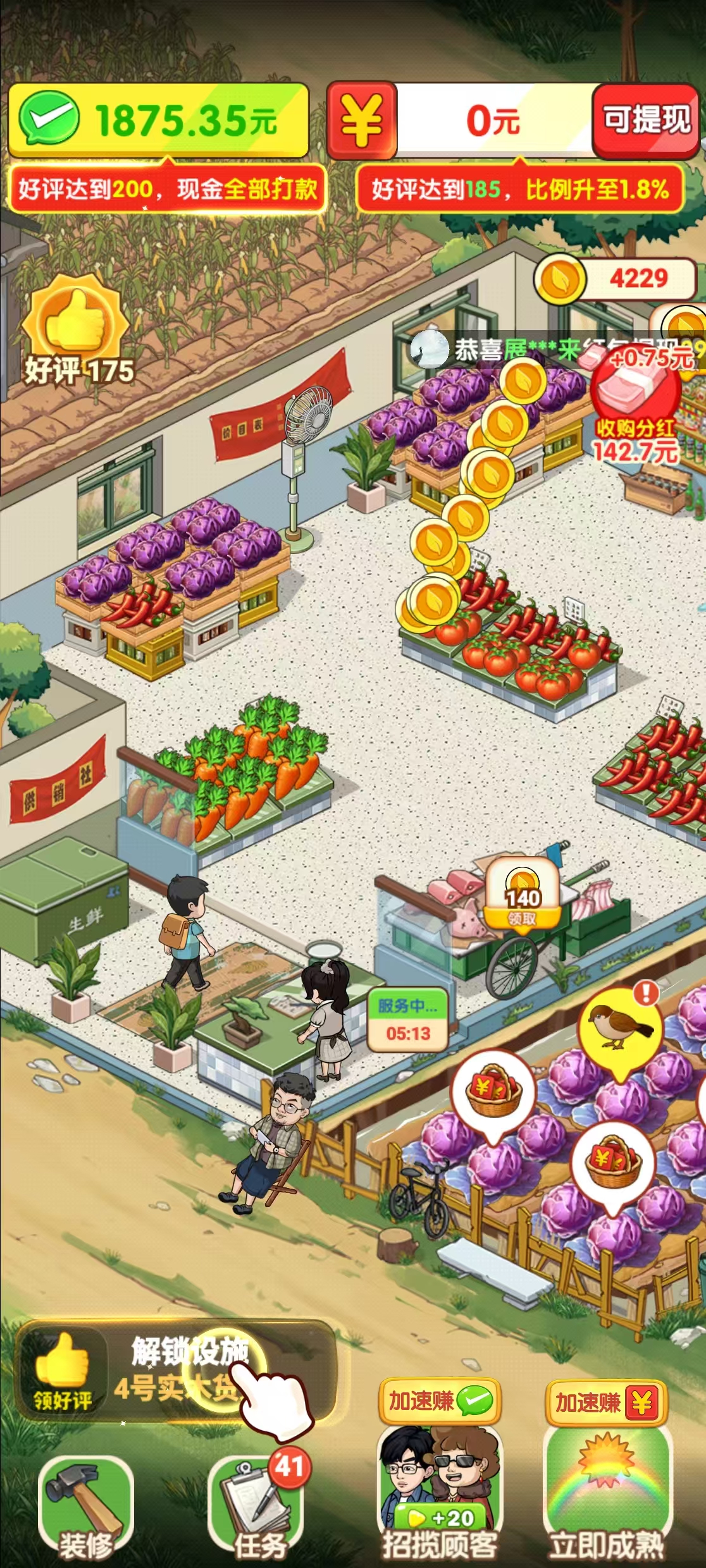 《奶奶的小院》是一款画风温馨的田园合成经营游戏,其收益模式极其明确:适合赚取每天几元的零钱,但完全不适合大额提现。游戏通过合成农作物、完成订单获取红包,几毛到1元的小额提现通常较为顺畅,符合其“小院收成”的轻松定位。然而,一旦尝试提取10元以上的金额,系统便会转入漫长的人工审核,失败率很高,这从根本上限制了收益上限。总结: 它适合喜欢合成玩法、只想用碎片时间(每天15-20分钟)稳定攒点奶茶钱的佛...